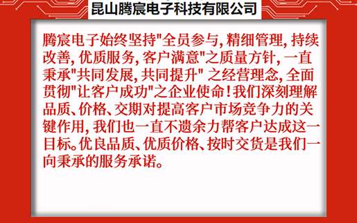 昆山騰宸電子科技有限公司位于中國(guó)線路板加工之都昆山千燈,公司專注于電路板研發(fā)設(shè)計(jì)、PCB抄板、元器件采購(gòu)、SMT貼片加工、組裝測(cè)試,為客戶提供一站式電子制造服務(wù)。騰宸電子始終堅(jiān)持"全員參與,精細(xì)管理,持續(xù)改善,優(yōu)質(zhì)服務(wù),客戶滿意"之質(zhì)量方針,一直秉承"共同發(fā)展,共同提升" 之經(jīng)營(yíng)理念,全面貫徹"讓客戶成功"之企業(yè)使命!我們深刻理解品質(zhì)、價(jià)格、交期對(duì)提高客戶市場(chǎng)競(jìng)爭(zhēng)力的關(guān)鍵作用,我們也一直不遺余力幫客戶達(dá)成這一目標(biāo)。優(yōu)良品質(zhì)、優(yōu)質(zhì)價(jià)格、按時(shí)交貨是我們一向秉承的服務(wù)承諾。 ...